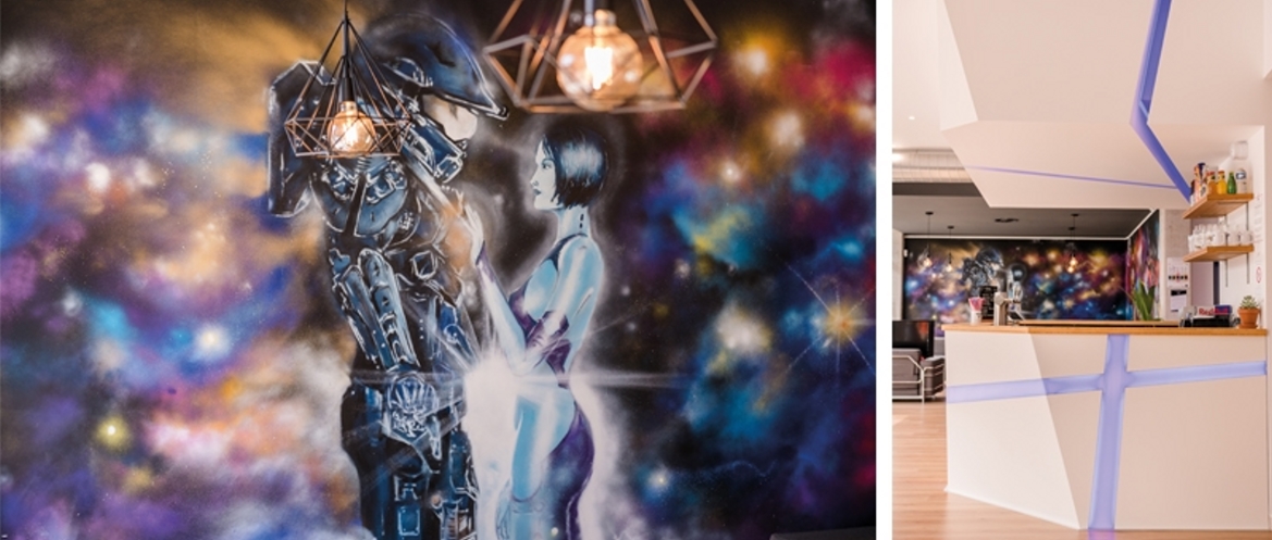 Création du premier centre Esport d’Occitanie dans le quartier de Montaudran. Dans un local vide de 300 m2 a été aménagé un lieu entièrement dédié au gaming sous toutes ses formes. Salles PC, espace consoles et réalité virtuelle s’articulent autour d’un bar central pensé comme noyau du projet : lieu de rencontre et de convivialité. La culture urbaine vient ici au service de l’univers geek par l’intégration d’une fresque murale dans l’espace lounge des consoles. Enfin, une cloison amovible permet la privatisation d’une partie du local dans le but d’en diversifier ses usages. Quand l’architecture permet de s’immerger toujours plus dans l’univers du jeu vidéo…