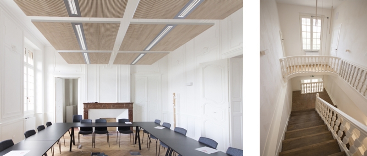 Ecocert, société qui accompagne les organisations dans le déploiement et la valorisation de pratiques durables à travers la formation, le conseil et la certification, a fait l'acquisition de cette ancienne maison de maître de 600 m2 située à l'Isle-Jourdain pour agrandir ses bureaux et accueillir 45 salariés. En collaboration avec : AB2 ARCHITECTURE Cette maison de maître de la fin du 18ème siècle située à l'emplacement des anciennes fortifications était "dans son jus", au charme désuet utilisée uniquement en villégiature estivale pour une grande famille mais présentait un manque d'entretien évident. Notre intervention s'est portée sur l'ensemble du bâti sur 3 niveaux plus 2 ailes indépendantes. Nous avons conservé au maximum les matériaux anciens présents dans la maison (sols en tomettes, moulures murales et en plafonds, portes anciennes à panneaux, escalier principal au style Louis XIII). Même si les interventions ont été parfois lourdes dans certains espaces par la nécessité d'une mise aux normes P.M.R. ou pour pallier à des problèmes de structure, le but était de donner à lire un résultat délicat, respectueux en utilisant des matériaux locaux qui auraient pu être déjà présents et des mises en œuvre traditionnelles notamment pour les enduits à la chaux. Les bureaux sont chauffés grâce à une chaudière à granulés de bois et ventilés avec une VMC double flux.