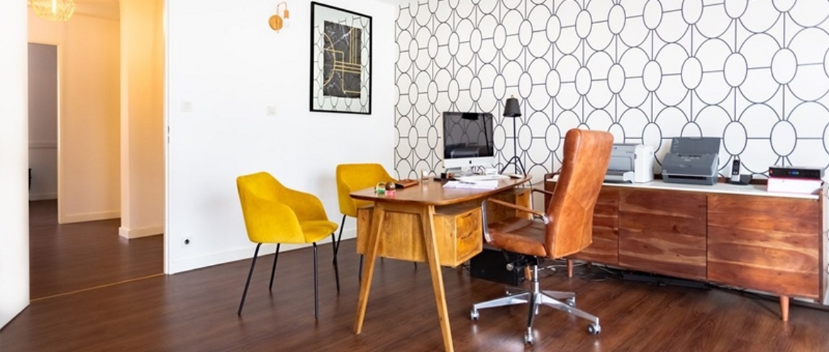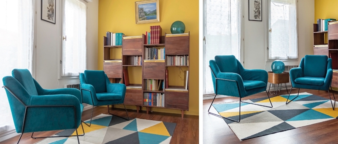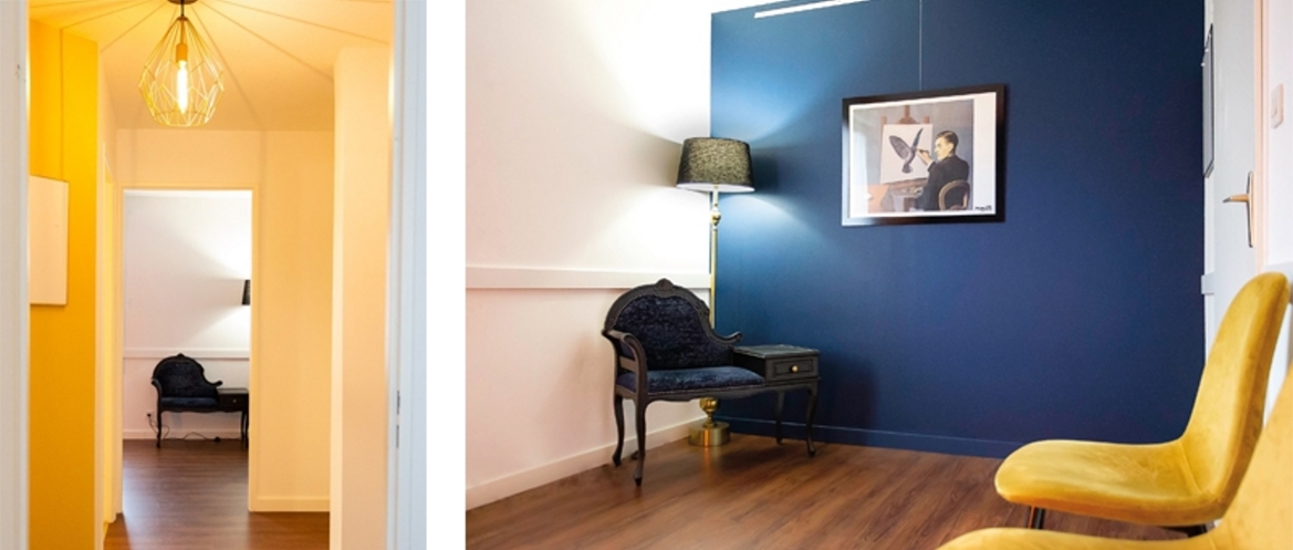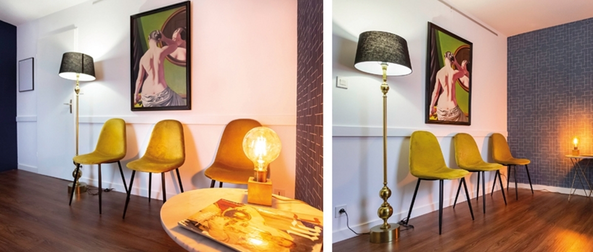 Pour ce projet, l’objectif était clair. Créer un réel renouveau pour ce cabinet resté en l’état depuis 20 ans, avec la contrainte de refaire et d’aménager tous les espaces en 3 semaines. Les couleurs des murs, le sol et tous les éléments décoratifs (mobilier, luminaires,…) d’origine ont fait peau neuve. Seuls quelques tableaux chargés d’histoire ont été rénovés et conservés pour être mis en valeur. Côté style, un esprit Art Déco pour donner une véritable identité tout en y apportant de l’originalité. Le bois présent pour les principales pièces de mobilier et au sol avec un parquet de couleur sombre, apporte une sensation rassurante d’authenticité. Une harmonie de couleurs tendance mais aussi pour être en accord avec l’activité du lieu selon leurs principales symboliques (bleu pour la sagesse et la sérénité, jaune pour la chaleur et la gaieté). Pour ne pas créer de surcharge visuelle, de la couleur et de jolis papiers peints sur un seul pan de mur par espace et du blanc, pour la clarté, sur tous les autres murs. L’agencement des éléments de mobilier joue un rôle pour favoriser une fluidité de circulation. Grâce aux échanges partagés avec mon client, la qualité et le savoir-faire de l’artisan, le projet a pu être mené à son terme. Une transformation réussie !