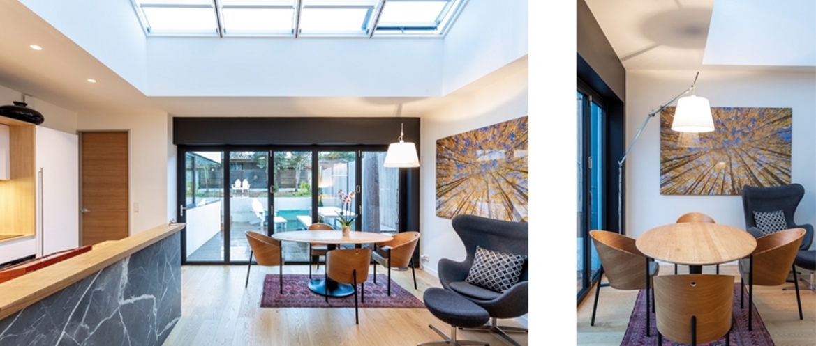 Celui-ci à été pourvu d’une extension composée d’un grand chapiteau de verre permettant d’observer les étoiles. Cette généreuse ouverture sur le ciel revêt une importance essentielle, illuminer l’ensemble du rez-de-chaussée. Les pièces de nuit conçues en second jour, sont de ce fait baignées de lumière.