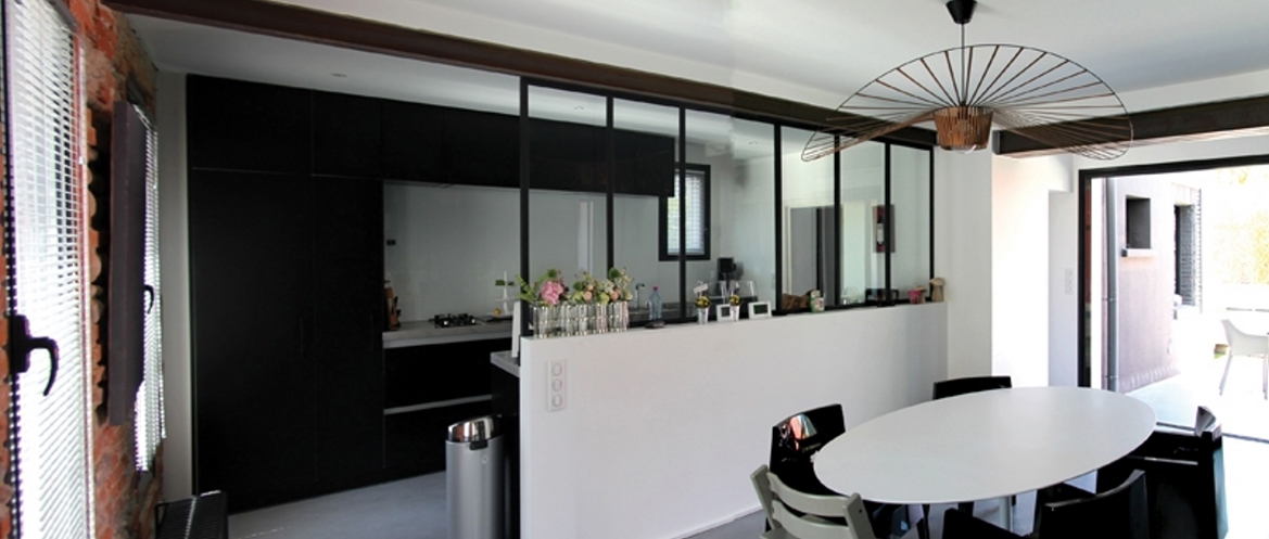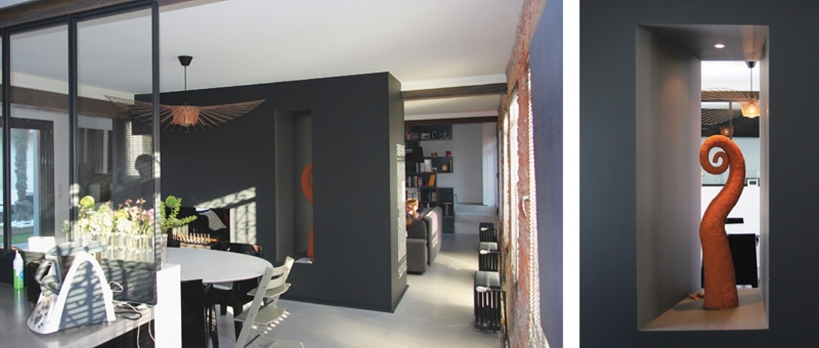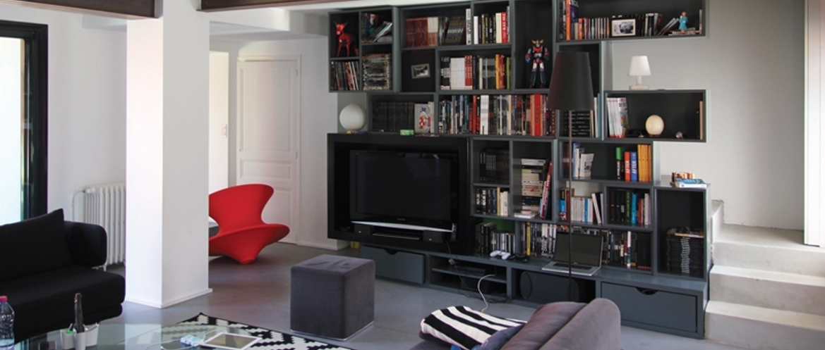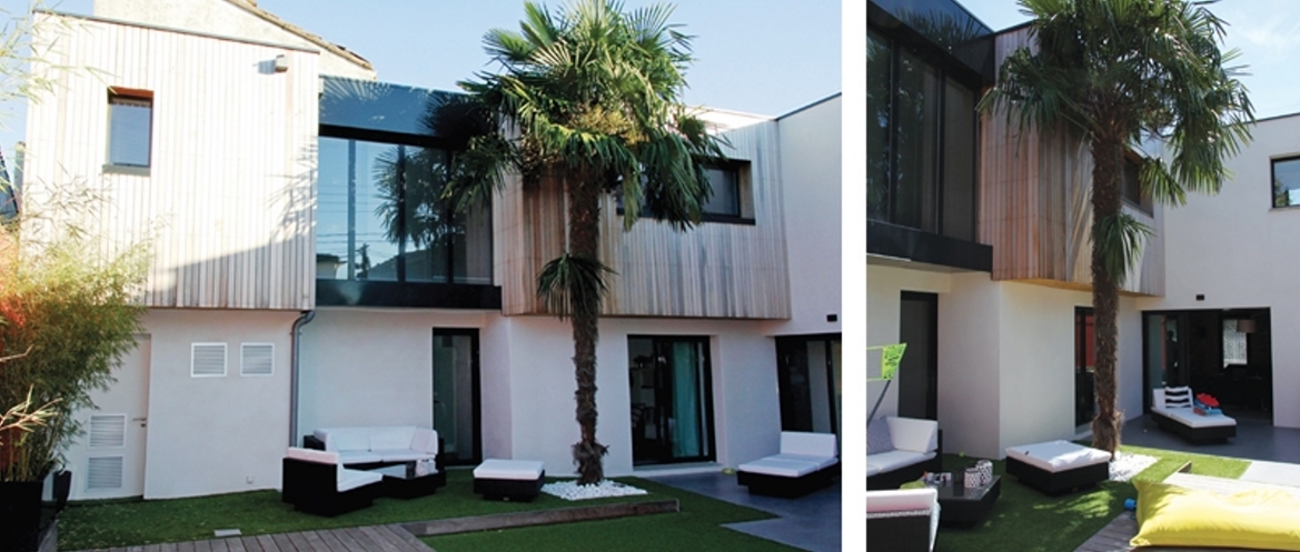 La maison existante est constituée d’une belle toulousaine en RDC et d’un volume existant sur deux niveaux, créant ainsi une cour intérieure. Le projet propose de créer une surélévation du volume RDC en L, bardée verticalement de Red Cedar et d’aluminium gris anthracite. La cour intérieure délimitée par les différents volumes est refermée par un mur mitoyen d’une couleur rouge orangée très lumineuse. De faible surface, elle est aménagée en surface gazonnée, terrasse béton et terrasse bois. La piscine en longueur est totalement refermable par le couvercle qui permet de récupérer l’espace en terrasse bois. Une unité est donnée à l’ensemble des espaces par la continuité des sols intérieurs et extérieurs traités par le même béton ciré. Les pièces de vie constituent un grand volume ouvert tout en longueur, délimité par la bibliothèque, la cheminée et la verrière de la cuisine. Cette longueur est accentuée par le linéaire de mur en briques et galets qui a pu être restauré, par l’enfilade de fenêtres noires et de radiateurs. Des jeux de transparence ponctuels sont possibles par les ouvertures du volume de la cheminée. Une bibliothèque réinterprétant le jeu Tétris a été dessinée pour délimiter la circulation verticale et créé un objet dynamique s’accordant aux tons de blancs, gris et noir.