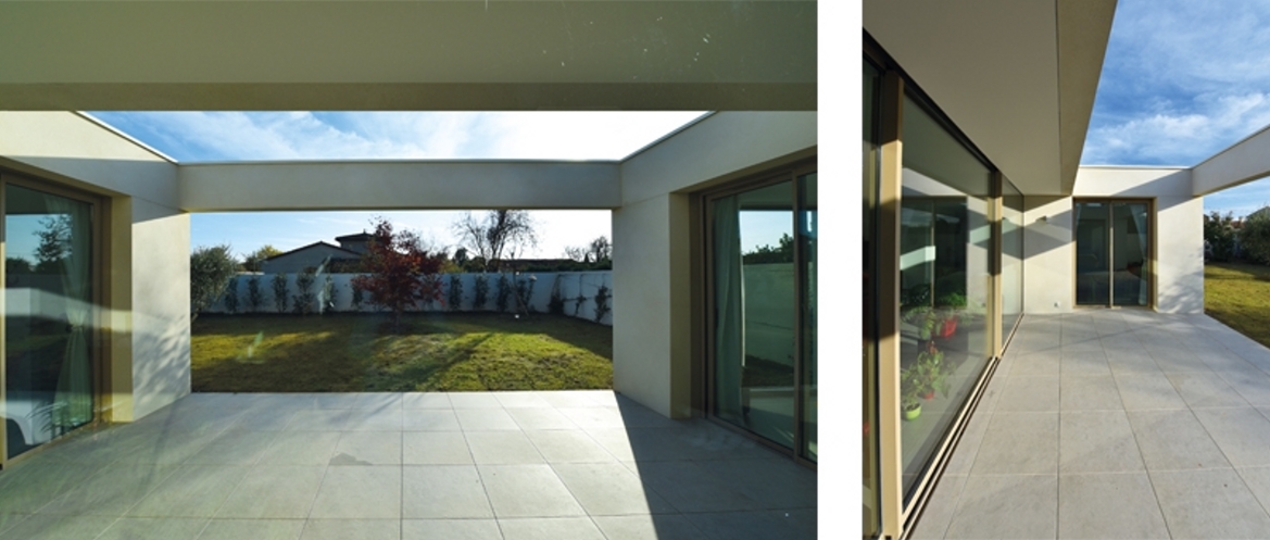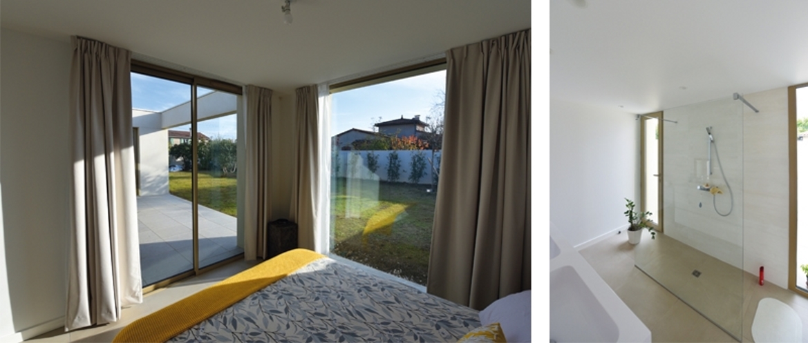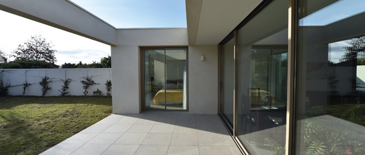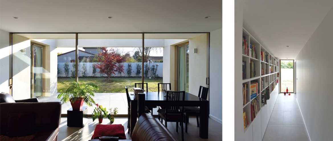 L'apparente fermeture de cette maison est un leurre. Ici, il sera question de protéger son intimité sur ses façades mitoyennes (aveugles car mitoyennes). La maison dispose d’une cour ouverte sur le jardin et permettant de conférer une certaine intimité aux occupants en coeur de maison, ainsi qu’une petite cour d’agrément, à la jonction des deux façades aveugles, octroyant lumière et ventilation.
