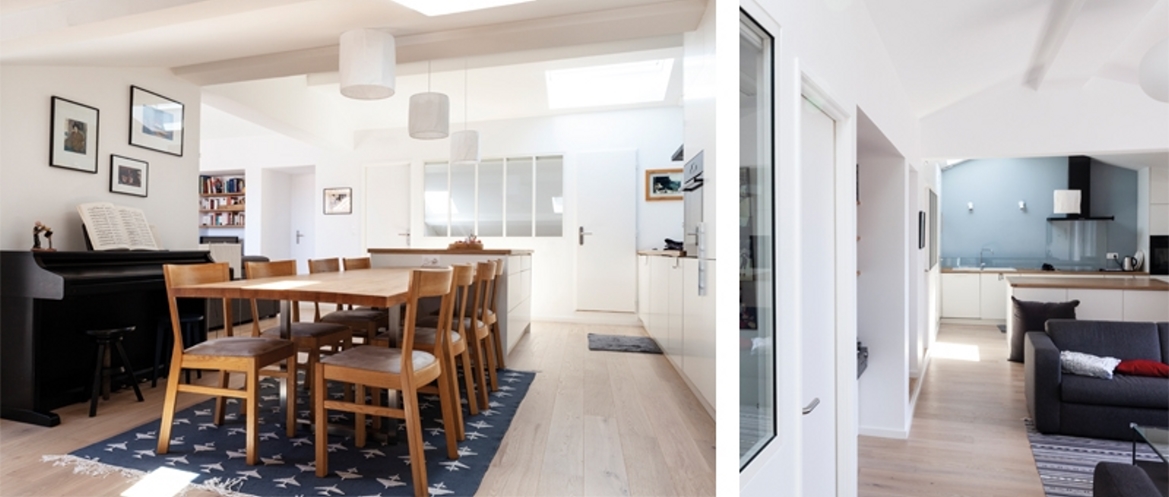 La pièce de vie qui accueille à la fois la cuisine, le séjour, le salon et le bureau s’organise directement autour de cette percée tout en s’étendant sur l’intégralité de la largeur disponible. Au second plan, une longue façade intérieure vient soutenir cet effet de perspective et permet aux chambres situées à l’arrière de s’ouvrir en second jour par l’intermédiaire de verrières d’atelier. Ce jeu de vues traversantes créent une sensation de mise en abîme qui permet aux espaces de communiquer entre eux tout en étant dissociés.