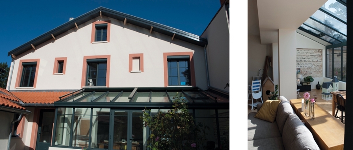 Rénovation et restructuration d'une villa atypique de 4 m de profondeur pour 13 m de large, au fond d'un grand jardin.
