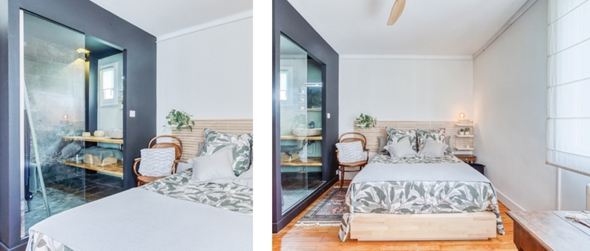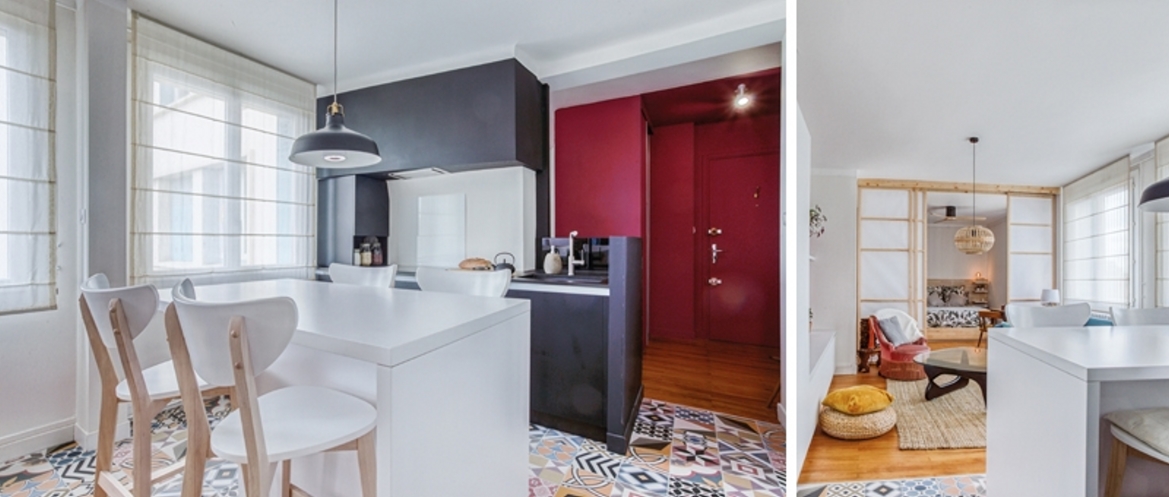 L’entrée ouverte sur la pièce à vivre est marquée par un cube de couleur. Il marque le point d'accueil et nous sommes invités à suivre le grand pan de rangement qui nous guide vers le salon. La transition est légèrement marquée par un changement de sol coloré en carrelage. La série de placards dissimule astucieusement une grande partie de la cuisine se limitant à première vue à un volume noir et îlot, table à manger blanche. Les fonctionnalités et le type des espaces sont subtilement définis. De la même façon la chambre se dévoile en continuité du salon par la simple manipulation de panneaux japonais coulissants, l’écrin s’agrandit. La salle d’eau auparavant minuscule a pris ses aises sur le coin nuit tel un nouveau cube imbriqué, posé et affirmé par son caractère noir.