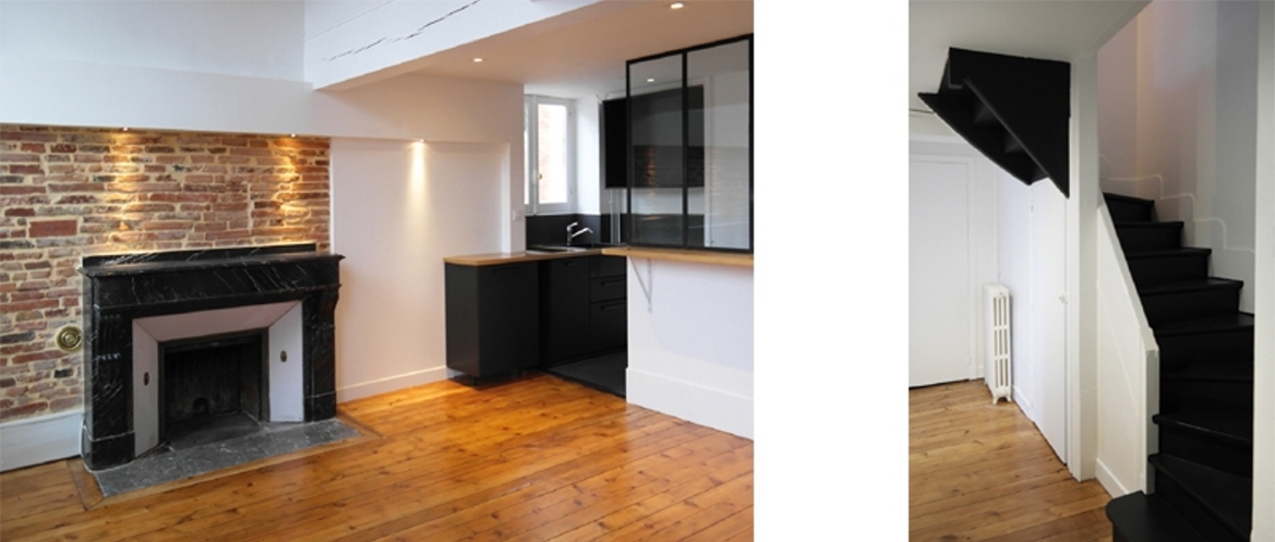 Pour retrouver son aspect d’origine, nous avons d’abord traité le sol, puis rouvert le conduit de cheminée, avant de découvrir la brique chère à notre ville, autrefois cachée par les doublages et autres papiers peints.