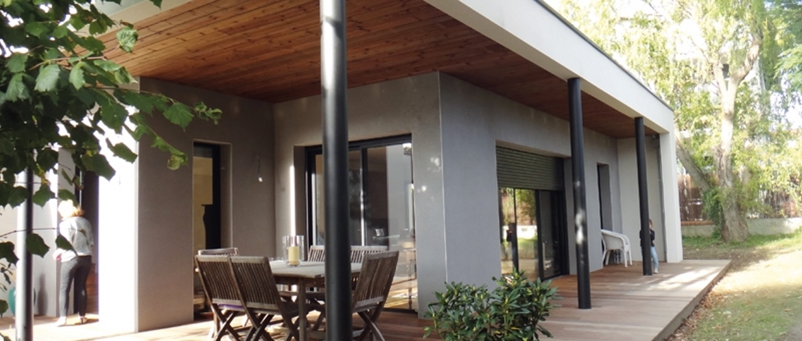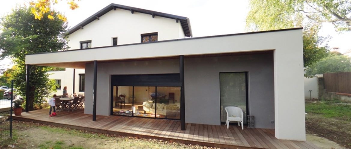 Les extensions sont reconstruites, avec des volumes plus contemporains ; les espaces de vie sont prolongés par une grande terrasse couverte, offrant un prolongement des espaces intérieurs et formant une protection solaire de l’ensemble.