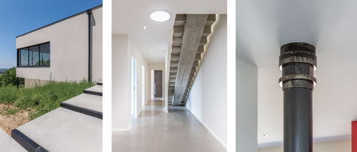 D'une architecture très radicale, la Maison Z. étend ses 230 m² habitables sur 2 niveaux parfaitement superposés. Implantée sur un terrain très pentu des coteaux de Toulouse, elle bénéficie d’une vue panoramique sur le sud de l’agglomération et sur les Pyrénées. Les propriétaires souhaitant profiter au maximum de cette vue, la maison s’installe sur le haut du terrain, et c’est l’étage supérieur qui accueille les pièces de jour ainsi que la suite parentale. Suivant cette disposition peu classique, la piscine vient s’installer à mi-pente, épousant elle aussi les courbes de niveaux du terrain. Ainsi depuis chaque espace de la maison, qu’il soit intérieur ou extérieur, le paysage s’offre en panoramique pour un effet changeant et toujours surprenant au fil des heures et des saisons.