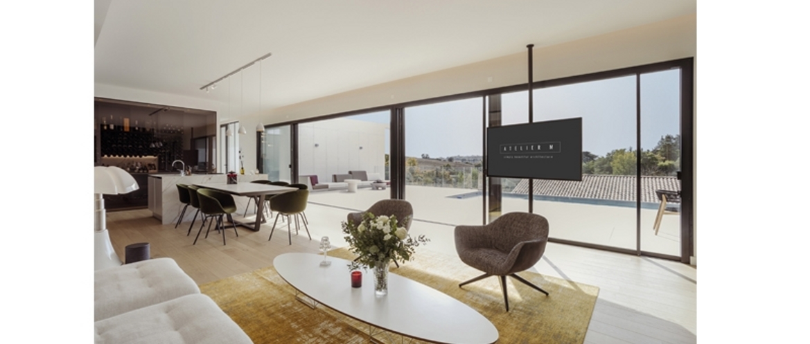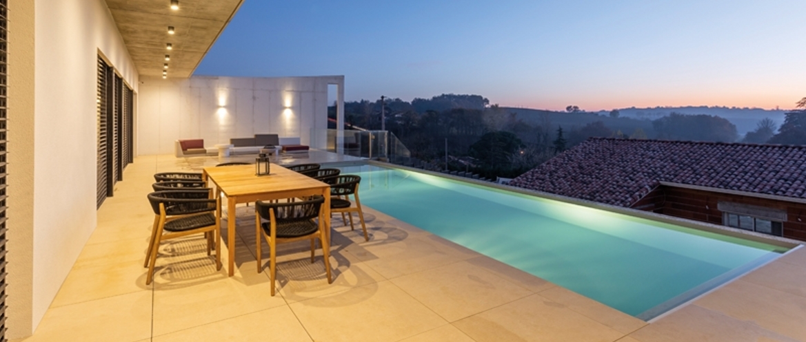 Cette maison de plein pied située au nord/ouest de Toulouse se compose d’un volume principal en L qui favorise une vue depuis toutes les pièces sur les collines verdoyantes de la région et sur la piscine.