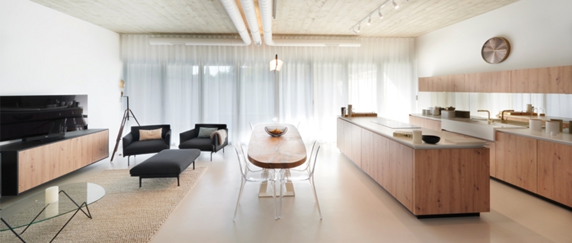 Le brutalisme se retrouve également à l’intérieur de la maison, sol en béton, plafond en béton coulé avec des planches de bois, réseaux apparents…