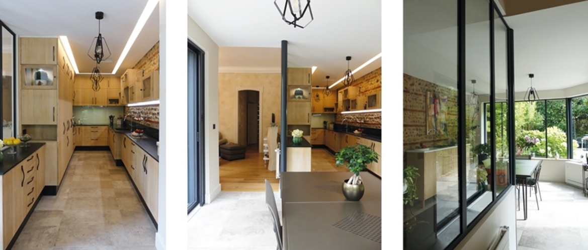 Les mobiliers de la cuisine, en chêne massif et sur-mesure, jouent avec la linéarité du volume existant tout en le prolongeant jusqu’à l’extension. Les plans de travail sont en granit noir et en lave émaillée. Le sol de l’extension et de la cuisine reçoit un sol en pierre naturelle. La liaison visuelle entre salon et extension est augmentée par la création d’une baie fixe à meneaux et à profilés acier.