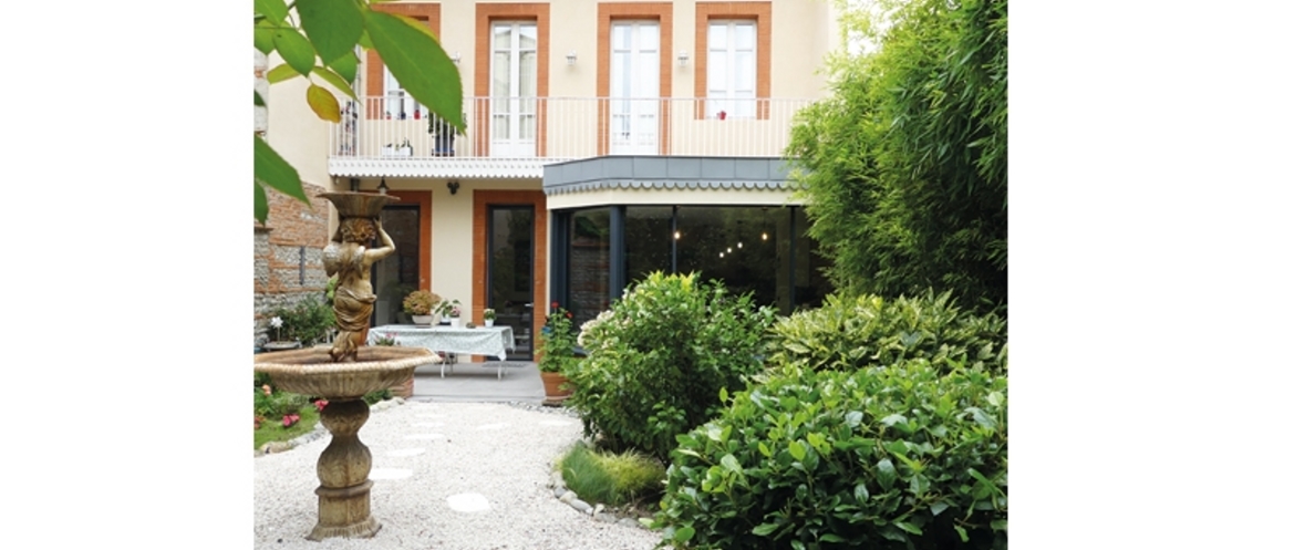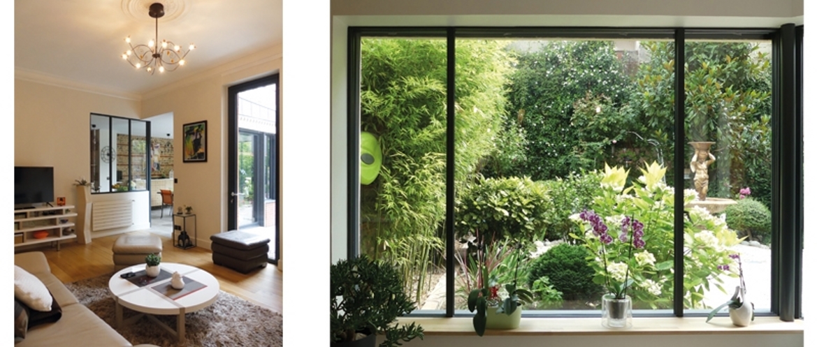L'avancée bâtie réalisée, largement vitrée, créée une plongée panoramique dans le jardin arboré et animé.