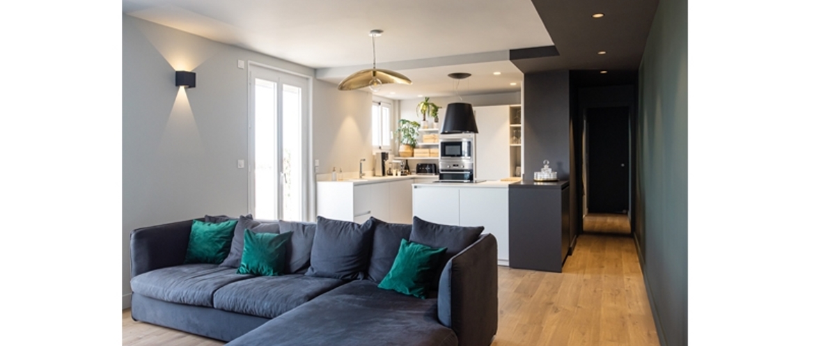 Une inversion de la salle d'eau et cuisine. La cuisine s’invite maintenant dans le salon et s’ouvre sur le couloir.