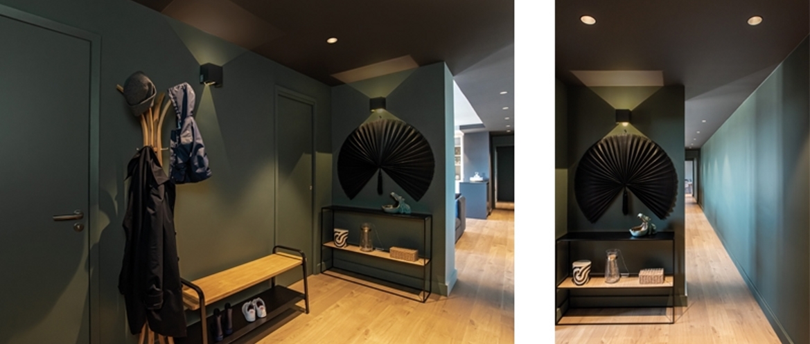 Un marquage du corridor de 11 m de long par un vert profond, un faux-plafond anthracite et une distribution de spots. Ce podium distribue les nouveaux espaces jour/nuit.