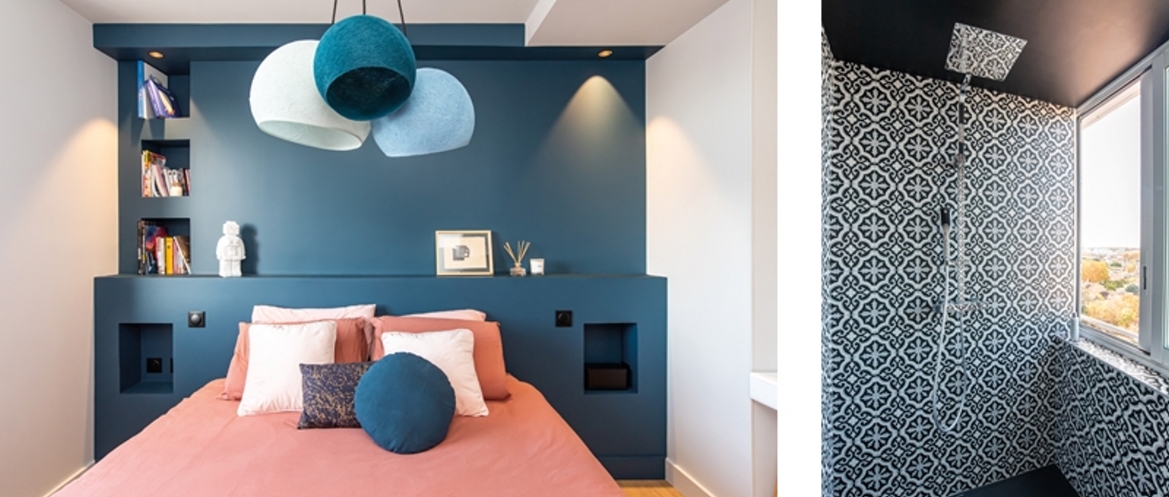 Une chambre parentale avec son aménagement tête de lit en bleu nuit.