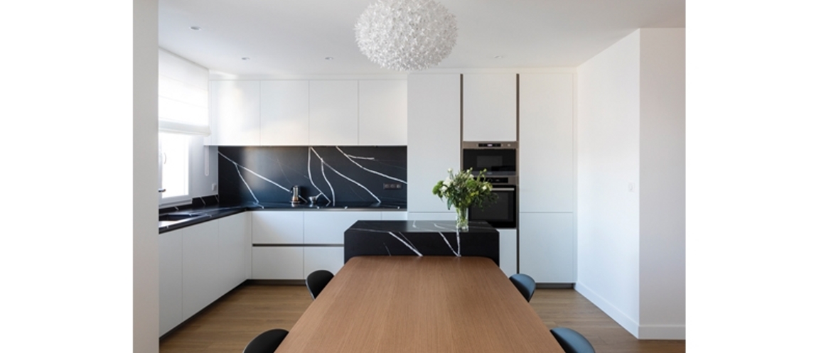 Dans l’espace de vie, souffle un vent de modernité qui offre des proportions généreuses alliant design et matières chaleureuses. La cuisine est résolument élégante et contemporaine avec des façades blanches et un plan de travail avec une ligne graphique qui apporte du caractère et se marie avec la table en bois.