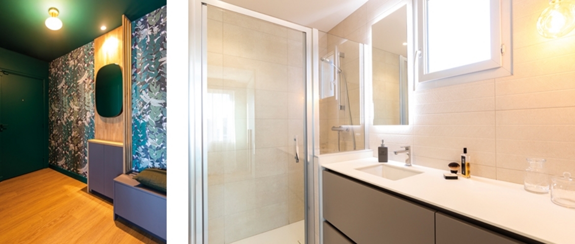 J’ai souhaité dès l’entrée de l’appartement insuffler du caractère d’où le choix d’un vert foncé qui donne de la profondeur et s’accorde avec le papier peint végétal et le mobilier dessiné sur mesure.