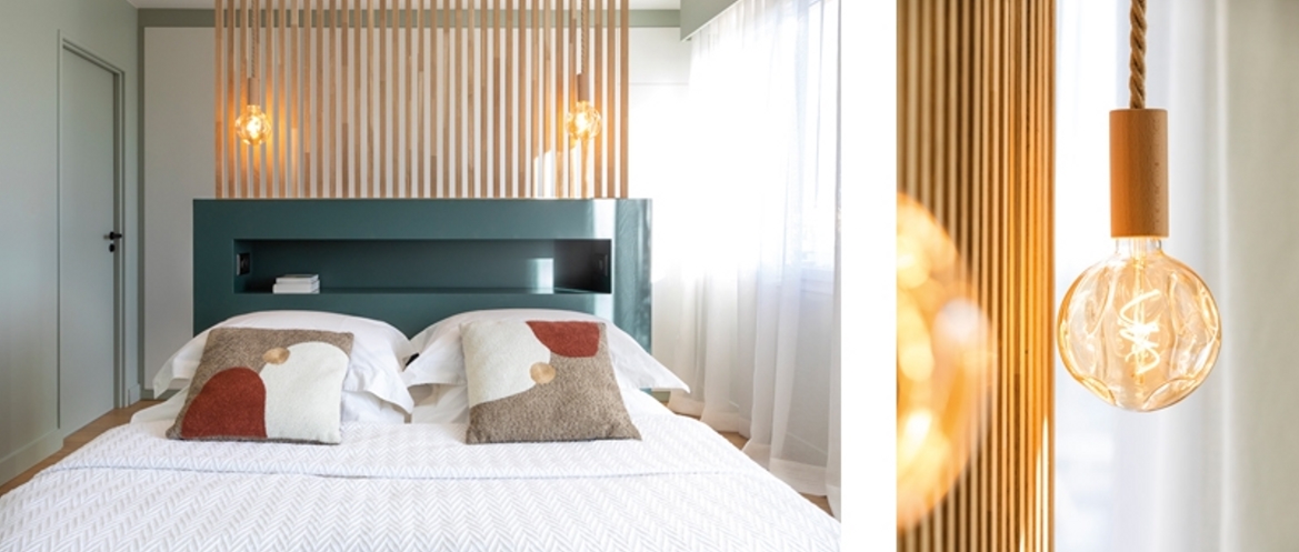 Dans la suite parentale, la pièce maitresse est la tête de lit avec le claustra qui permet de délimiter l’espace dressing qui se situe en second plan. La salle de bains jouxte la chambre et révèle un univers doux.