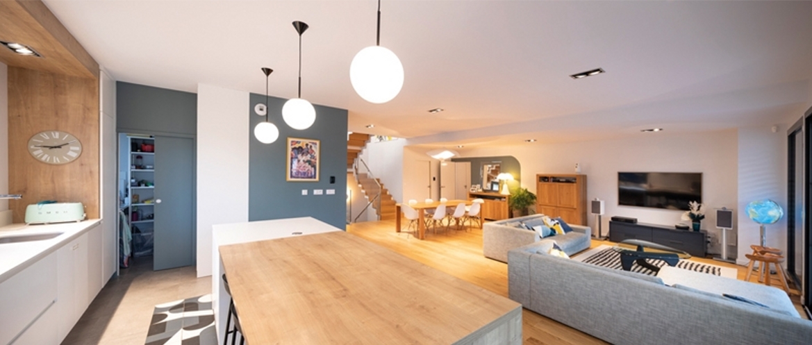 L’entrée, quant à elle, située à l’ouest, vitrée en double hauteur, apporte une luminosité intéressante et généreuse.