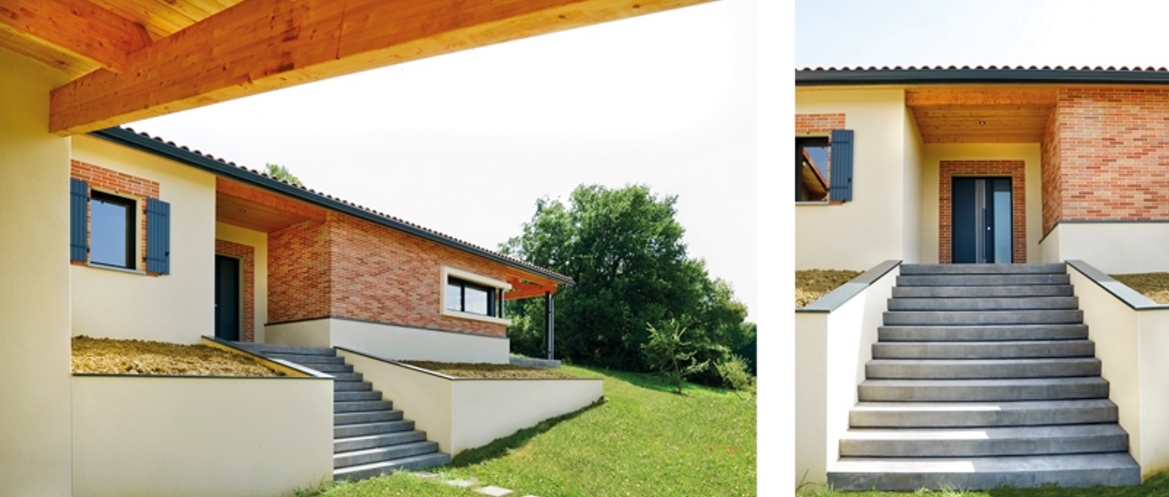 La maison s’oriente également vers cette vue splendide. Elle comprend deux parties bien distinctes : le coin nuit et le coin jour, séparée par une entrée traversante (vue vers le jardin depuis la porte d’entrée au travers d’une verrière intérieure), indiquées en façade par un changement de matériaux (briquettes sur la zone jour, enduit sur la partie nuit).