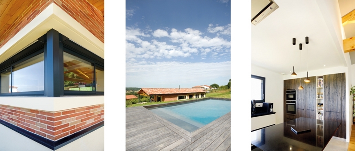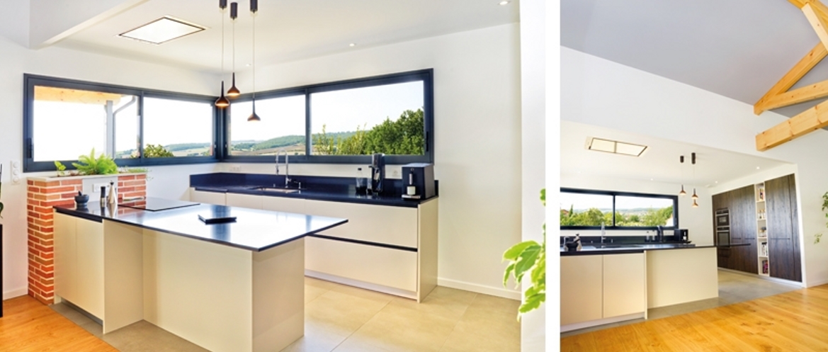 Pour apporter une écriture contemporaine, les encadrements de fenêtres sont marqués par des cadres en béton. La cuisine s’ouvre sur l’extérieur par une très grande fenêtre d’angle.