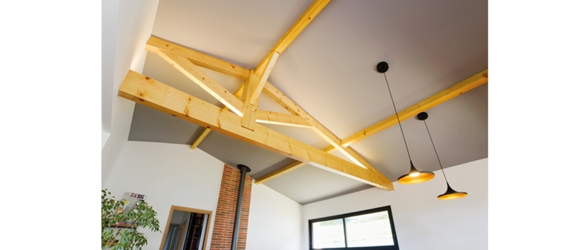 A l’intérieur, la charpente traditionnelle en bois non peint, mise en valeur par le plafond gris et l’éclairage, apporte beaucoup de chaleur. Les briquettes se retrouvent par touches au niveau du poêle et de la cuisine.