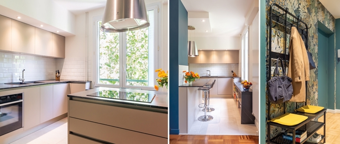 Afin de réduire le couloir, la cloison entre la cuisine et celui-ci a été supprimée au bénéfice d’un vestiaire et d’un grand passage.