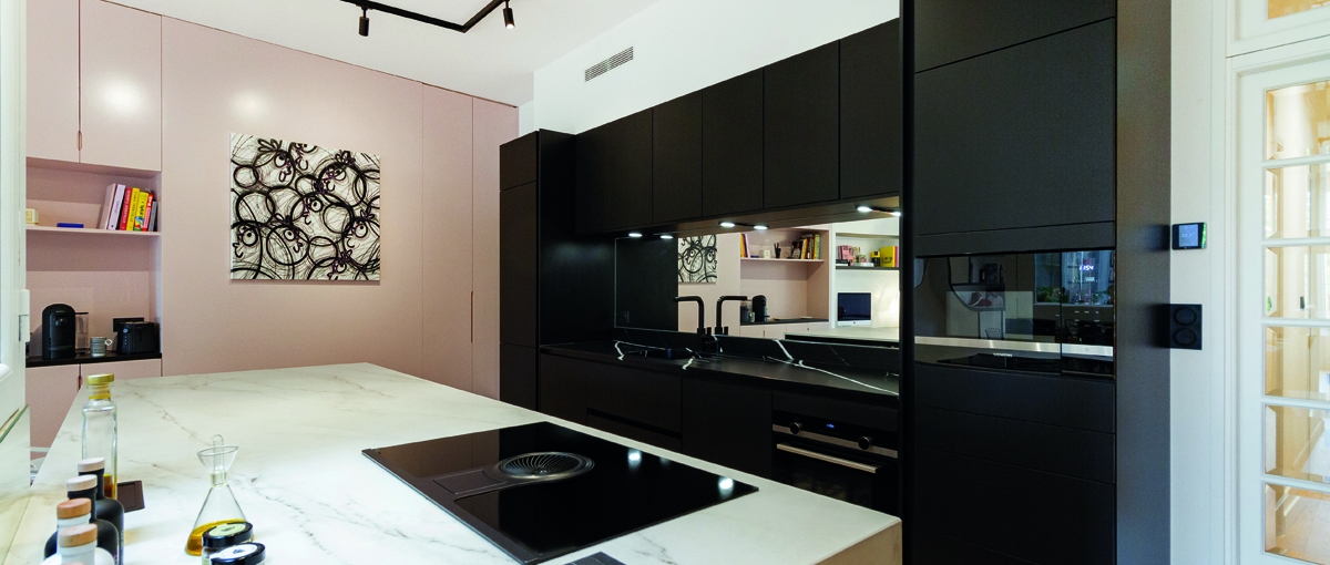 Les couleurs se répondent dans tout l’appartement : les nuances de vert choisies pour la chambre font écho au jardin classé qui sert de point de fuite à la pièce à vivre, le rose de la cuisine et de la salle d’eau reprend celui du mur de briquettes, etc. Dans la pièce à vivre de 70 m2, Hugo Soual a aussi joué avec les volumes et l’invisible, notamment grâce à de spectaculaires étagères sur mesure, bordées de noir, qui trompent notre vision.