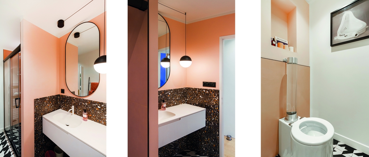 Cette pièce souvent oubliée est ici un clin d’oeil à Duchamp, qui transforma un urinoir en oeuvre d’art en l’intitulant « Fontaine ». Les toilettes choisies par l’architecte d’intérieur sont elles aussi bien singulières et mises en valeur par un carrelage pied de coq et, comme il se doit, par une touche de rose.